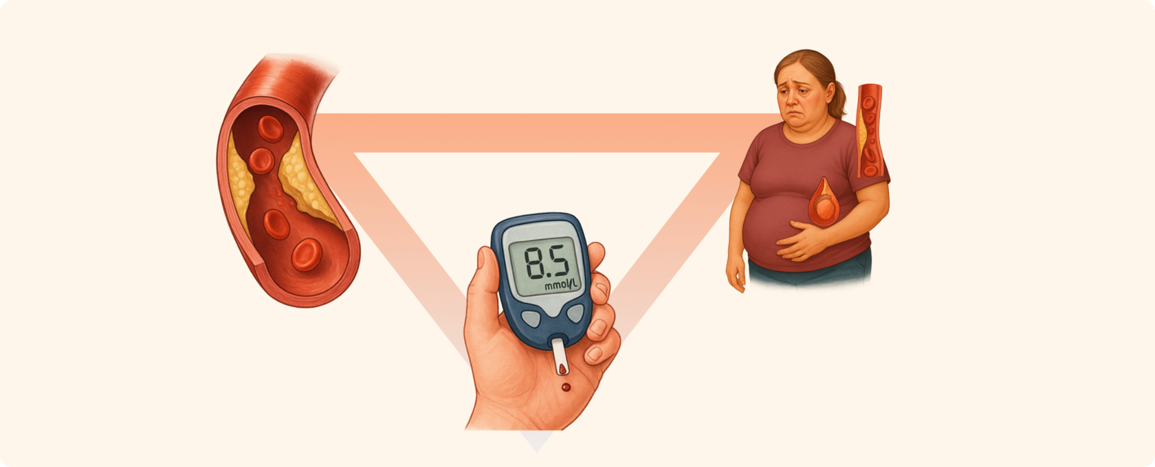 Le diabète, l’hypertension et le surpoids ne sont pas simplement trois diagnostics distincts. Ce sont trois forces qui se renforcent mutuellement. Un dysfonctionnement en déclenche un autre, puis un troisième. Ainsi se forme un cercle vicieux dont il devient de plus en plus difficile de sortir.